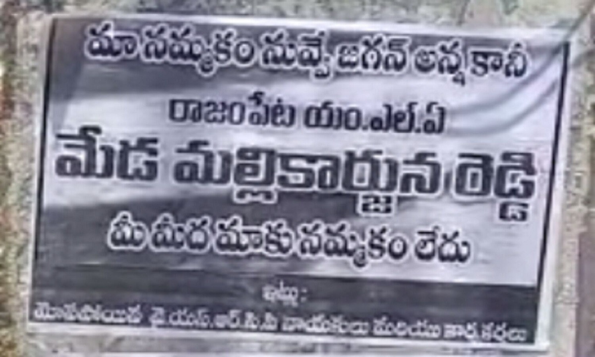 తాజాగా… “మా నమ్మకం నువ్వే జగనన్న, కానీ రాజంపేట ఎమ్మెల్యే మేడా మల్లికార్జున రెడ్డి పై మాకు నమ్మకం లేదు” అంటూ ఒక పోస్టర్లు వేశారు కొంతమంది కార్యకర్తలు. రాజంపేటలో కరెంట్ స్థంబాలపైనా, స్థానిక టిఫిన్ బండ్లపైనా, జనం రద్దీగా ఉండే రోడ్లపక్కనున్న గోడలపైనా… ఈ వాల్ పోస్టర్లు వేశారు. సీఎం జగన్ పై తమకు నమ్మకం ఉందని చెబుతూనే.. పరోక్షంగా ఆ ఎమ్మెల్యే తమకు వద్దు అంటున్నారంటే… ఎమ్మెల్యేని మార్చేయాలనేదే వారి ఉద్దేశం అని స్పష్టంగా అర్ధమవుతుంది. దీంతో… ఎమ్మెల్యే మేడా మల్లికార్జున రెడ్డి వ్యతిరేక వర్గం ఈ పోస్టర్లు వేసినట్టు చెబుతున్నారు. అయితే… ఈ పోస్టర్ లో… “మోసపోయిన వైసీపీ నాయకులు, కార్యకర్తలు” అంటూ పోస్టర్ల కింద రాయడం పరిగణలోకి తీసుకోవాల్సిన అంశం!