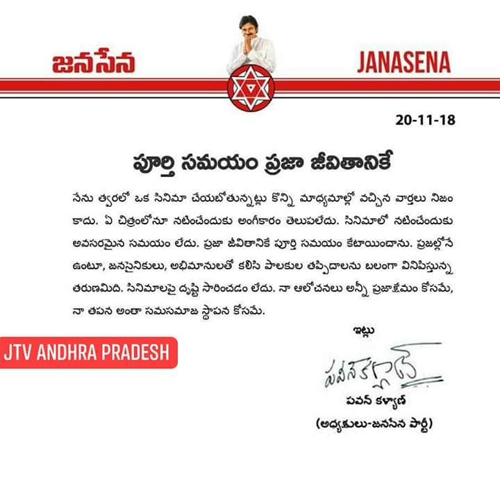 ‘నేను తర్వలో ఒక సినిమా చేయబోతున్నట్లు కొన్ని మాధ్యమాలలో వచ్చిన వార్తలు నిజం కాదు. ఏచిత్రంలోనూ నటించేందుకు అంగీకారం తెలుపలేదు. సినిమాలో నటించేందుకు అవసరమయిన సమయం లేదు. ప్రజాజీవితానికే పూర్తి సమయం కేటాయించాను. ప్రజల్లోనే ఉంటూ, జనసైనికులు అభిమానులతో కలసి పాలకుల తప్పిదాలను బలంగా వినిపిస్తున్న తరుణమిది. సినిమాలపై దృష్టి సారించడం లేదు.నా ఆలోచనలన్నీ ప్రజా క్షేమం కోసమే,నా తపన అంతా సమసమాజ స్థాపన కోసమే,’ అని ఆయన ప్రకటనలో పేర్కొన్నారు.