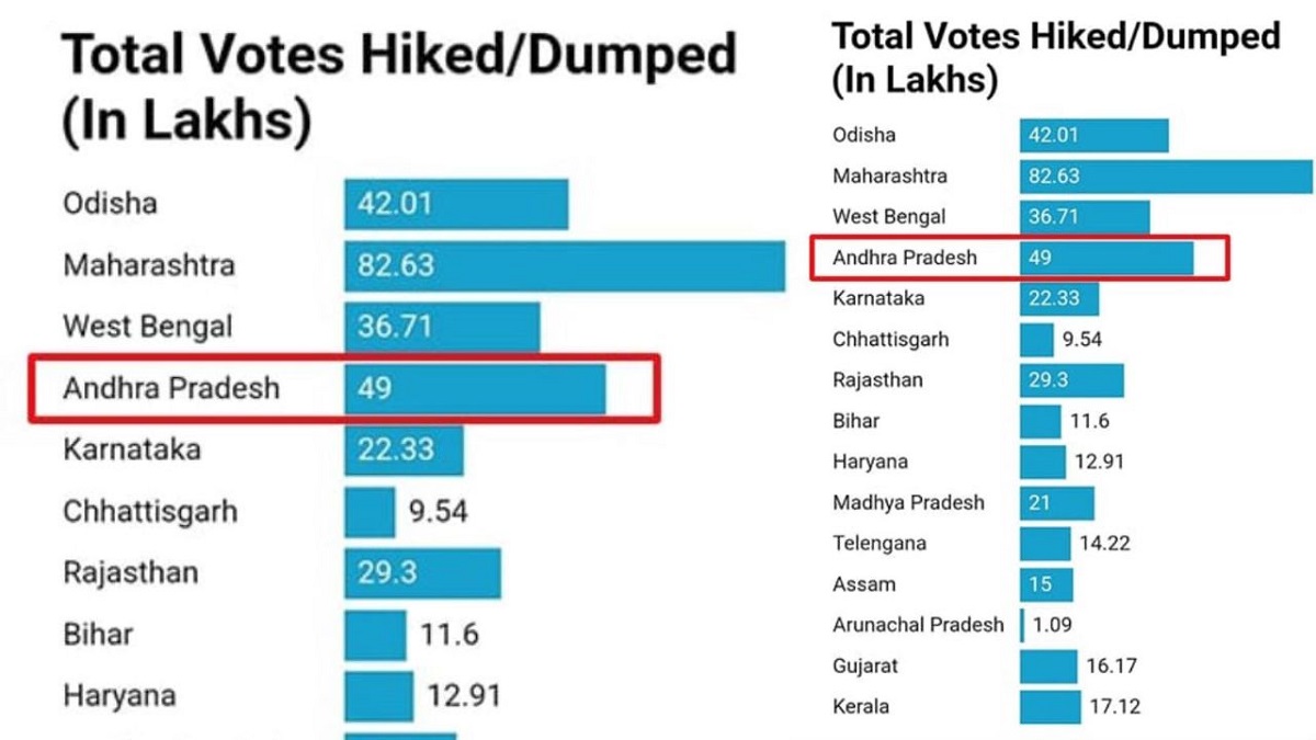 అయితే… ఈ మోసం ఏపీకే పరిమితం కాలేదని.. ఏపీలోని 49 లక్షల ఓట్లతో పాటు అత్యధికంగా మహారాష్ట్రలో 82.63, ఒడిశాలో 42.01, పశ్చిమ బెంగాల్ 36.71, రాజస్థాన్ 29.3, కర్ణాటక 22.33, మద్యప్రదేశ్ 21, కేరళ 17.12, గుజరాత్ 16.17, అస్సాం 15, తెలంగాణ 14.22, హర్యానా 12.91, బీహార్ 11.6, చత్తీస్ ఘర్ 9.54, అరుణాచల్ ప్రదేశ్ 1.09 లక్షల ఓట్లు ఫ్రాడ్ జరిగినట్లు సదరు సంస్థ తెలిపిందని అంటున్నారు.