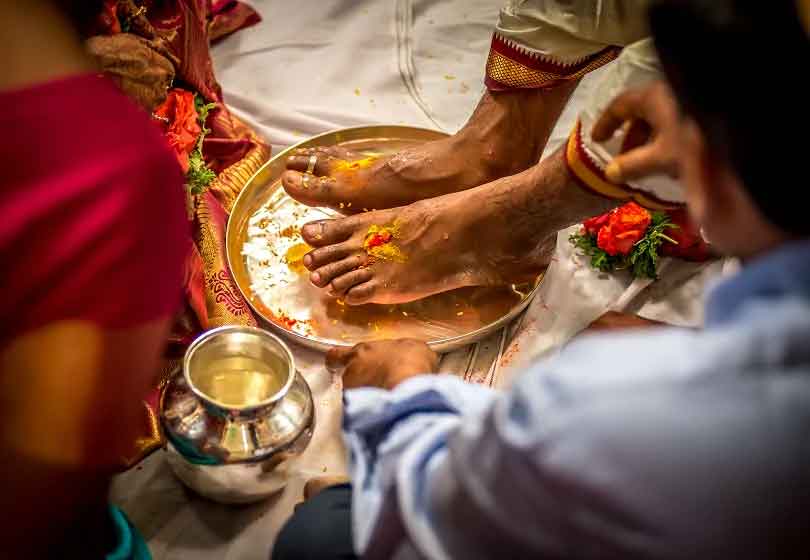 తర్వాత మాత్రం ప్రతీ సారి అల్లుడు మామ పాదాలకు నమస్కారం చేయాల్సిందే. ఈ విషయం పరిశీలిస్తే…వివాహంలో కన్యాదానం ప్రదాన తంతు. పెళ్లిలో వరుడి కాళ్లు వధువు తండ్రి కడగడం సంప్రదాయంగా వస్తోంది. ఇలా పెళ్లికొడుకు కాళ్లు కడగడానికి ఓ కారణ ముంది. అసలీ తంతు ఎలా జరుపుతారంటే… ముందు గా కళ్యాణ వేదికపై వరుణ్ణి పడమటి ముఖంగా కూర్చో బెడతారు. కన్యాదాత తూర్పుముఖంగా కూర్చుం టాడు. వరుణ్ణి శ్రీమహావిష్ణు స్వరూపునిగా భావించి కన్యాదాత పూజించి సత్కరిస్తాడు.