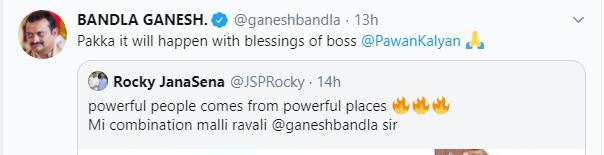 రాజకీయాల్లో బోల్తా పడ్డాక మళ్లీ సినిమా రంగం వైపు ఆశగా చూశాడు బండ్ల గణేష్. సరిలేరు నీకెవ్వరు చిత్రంలో చేసిన పాత్రకు నెగెటివ్ టాక్ రాగా.. ఇక సినిమాల్లో నటించడం కాదు, కేవలం సినిమాలను నిర్మించాలని ఫిక్స్ అయ్యాడట. ఓ భారీ బడ్జెట్, స్టార్ హీరో కోసం అన్వేషిస్తున్నాడట. ఈ క్రమంలో ఓ నెటిజన్ అడిగిన ప్రశ్నకు బండ్ల గణేష్ చెప్పిన సమాధానం ఆనందంలో ముంచెత్తుతోంది. పవర్ ఫుల్ పీపుల్స్ కమ్స్ ఫ్రమ్ పవర్ ఫుల్ ప్లేసెస్.. మీ కాంబినేషన్లో మళ్లీ సినిమా రావాలి అంటూ బండ్ల గణేష్ను ఓ నెటిజన్ కోరాడు. పక్కా.. మన బాస్ పవన్ కళ్యాణ్ ఆశీస్సులతో అది కచ్చితంగా జరుగుతుంది అంటూ హామీ ఇచ్చాడు బండ్ల గణేష్. ప్రస్తుతం ఈ ట్వీట్ను చూసిన పవన్ ఫ్యాన్స్ పండుగ చేసుకుంటున్నారు.