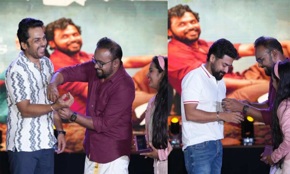ఈ క్రమంలో సినిమా వల్ల మంచి లాభం రావటంతో తమిళనాడు డిస్ట్రిబ్యూటర్ శక్తివేలన్ హీరో సూర్య కార్తీ లతో పాటు 2డీ ఎంటర్టైన్మెంట్ సీఈవో కి విరుమన్ సహనిర్మాత రాజశేఖర్ పాండియన్కు ఖరీదైన బహుమతులు అందజేశారు. ఈ క్రమంలో సూర్య, కార్తీ లకు డైమండ్ బ్రాస్లేట్స్ బహుమతి గా అందించగా.. ముత్తయ్యకు ఖరీదైన వజ్రపు ఉంగరాన్ని కానుకగా ఇచ్చాడు. ప్రస్తుతం దీనికి సంబంధించిన వీడియో సోషల్ మీడియాలో వైరల్గా మారింది