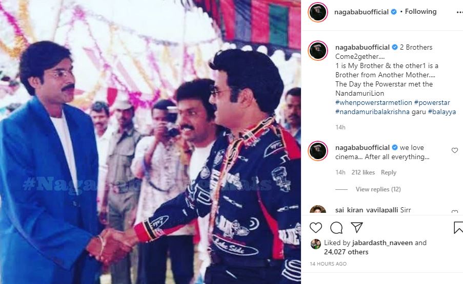 బాలయ్య కామెంట్లపై నాగబాబు శివాలెత్తిపోయాడు. వెంటనే క్షమాపణలు చెప్పాలని డిమాండ్ చేశాడు. ఆ గొడవ కాస్త సద్దుమణిగిన తరువాత మరో సందర్భంలో బాలయ్య గురించి మాట్లాడుతూ చాలా గొప్పగా చెప్పాడు. తాజాగా పనవ్ కళ్యాణ్, బాలయ్య షేక్ హ్యాండ్ ఇచ్చుకున్న ఫోటోను షేర్ చేస్తూ అదిరిపోయే కామెంట్ చేశాడు. బాలయ్యను నందమూరి సింహంగా కొనియాడుతూ.. బ్రదర్ ఫ్రమ్ అనదర్ మదర్ అంటూ సోదరభావాన్ని కురిపించాడు. దీంతో సోషల్ మీడియాలో అందరూ షాక్ అవుతున్నారు. ఇక ఆ ఫోటో సుస్వాగతం సినిమా షూటింగ్ ప్రారంభోత్సం నాటిదని తెలుస్తోంది.