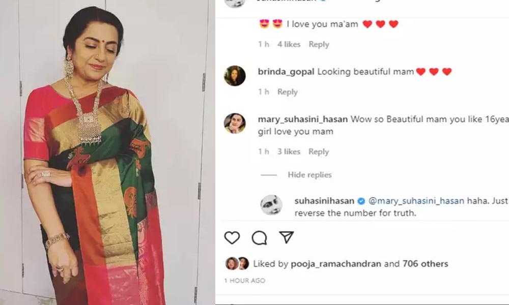 ఇలా సుహాసిని షేర్ చేసిన ఫోటోకి ఒక నెటిజన్ ఇచ్చిన కామెంట్ ఇప్పుడు వైరల్ గా మారింది. నెటిజన్స్ కామెంట్ చేస్తూ..మీరు చాలా అందంగా.. 16 ఏళ్ల అమ్మాయిలాగా కనిపిస్తున్నారు..లవ్యూ మేడం అంటు కామెంట్ పెట్టాడు. అయితే ఆ కామెంట్ చూసిన సుహాసిని ఎంతో ఫన్నీగా రిప్లై ఇచ్చారు. నెటిజన్ కామెంట్ కి సుహాసిని రిప్లై ఇస్తూ.. హహ అంటూ నవ్వేస్తూ.. జస్ట్ ఆ నంబర్ను రివర్స్ చేస్తే అదే నిజం అని తన వయసు 16 కాదు 61 అంటూ చెప్పుకొచ్చింది. ఇప్పుడు ఈ టాపిక్ వైరల్ గా మారింది.