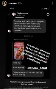 కొద్ది రోజులుగా ఈ సినిమా కోసం చేస్తున్న కసరత్తులకి సంబంధించిన ఫొటోలని షేర్ చేస్తూ వస్తుంది తాప్సీ. ఈ నేపథ్యంలో ఓ నెటిజన్ ఆమె బట్టలతో పాటు శరీరాకృతిపై కామెంట్ చేశాడు. పొట్టి దుస్తులు వేసుకొని గ్లామర్ షో చేస్తూ సినిమా రంగంలో రాణిస్తున్నావు. నీలో ప్రత్యేకత ఏమైన ఉందా ఫాల్తు దానా అంటూ కామెంట్ చేశాడు. దీనికి స్పందించిన తాప్సీ.. నేను ఏం చూపించానో తెలుసా నీకు? నా ప్రతిభను చూపించాను. అది నీకు అర్దం కాదు అంటూ గట్టిగానే బదులిచ్చింది సొట్టబుగ్గల సుందరి. తాప్సీ కిట్టీలో ‘లూప్ లపేట’, ‘హసీన్ దిల్రూబా’అనే చిత్రాలు కూడా ఉన్నాయి