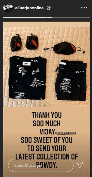 అదీ విజయ్ రేంజ్. అలా అనడం బన్నీ గ్రేట్ నెస్ కూడాను. అయితే బన్నీ ఎలా అన్నాకూడా విజయ్ తన ప్రేమను చాటుకుంటూనే ఉన్నాడు. తన దగ్గరకి కొత్త కలెక్షన్స్ వచ్చినప్పుడల్లా బన్నీకి పంపుతాడు. తాజాగా విజయ్ పంపిన కొత్త కలెక్షన్స్ను చూసి బన్నీ మురిసిపోయాడు. రౌడీ బ్రాండ్ లేటెస్ట్ కలెక్షన్స్ పంపించినందుకు థ్యాంక్యూవిజయ్.. సో స్వీట్ ఆఫ్ యూ అంటూ వాటిని సోషల్ మీడియాలో షేర్ చేశాడు బన్నీ.