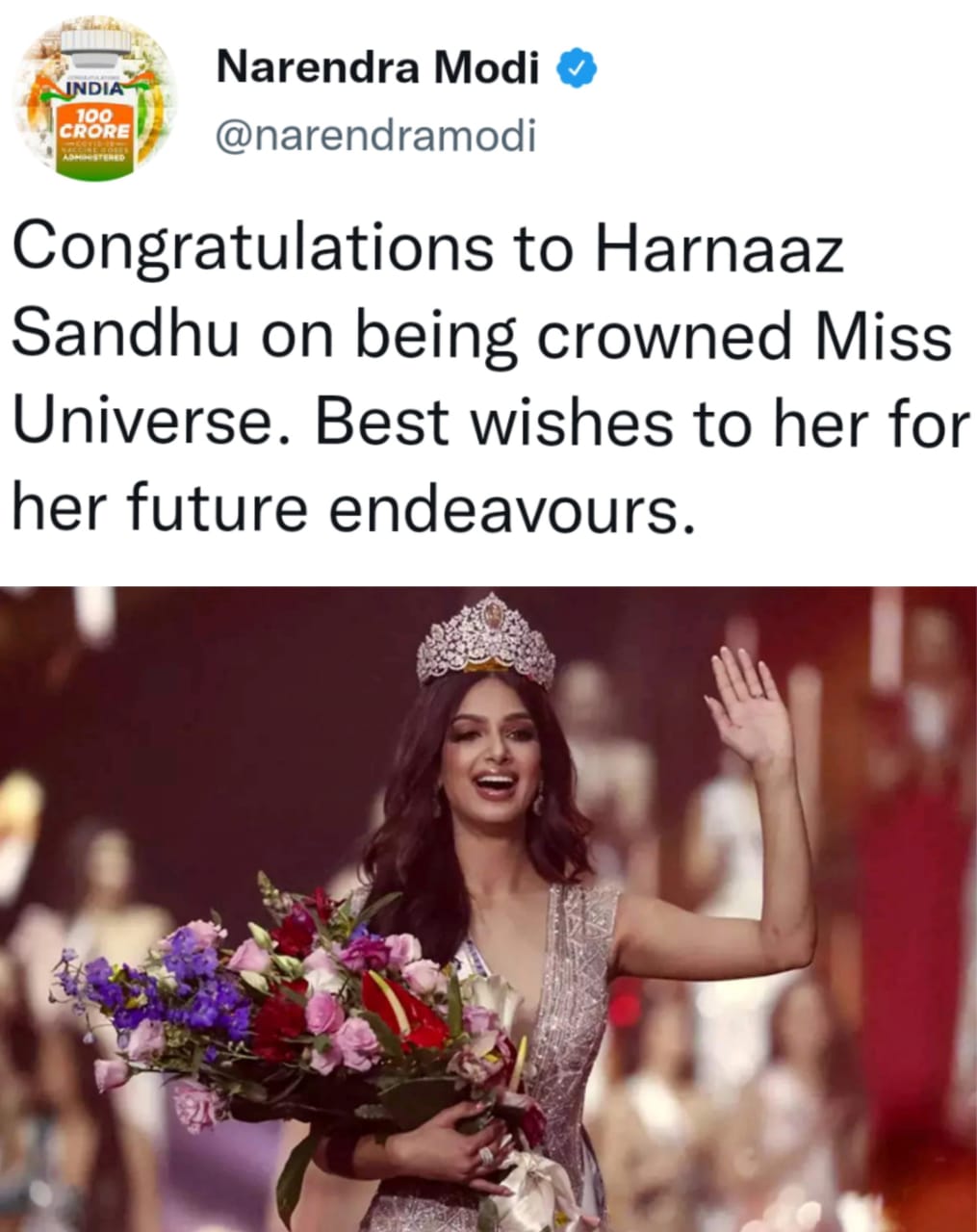 Harnaaz Sandhu: ఎన్నో సంవత్సరాల నీరీక్షణకి తెరదించుతూ మిస్ యూనివర్స్ కిరీటం సొంతం చేసుకొని చరిత్ర సృష్టించిన భారత యువతీ హర్నాజ్ సంధుకి ప్రధానమంత్రి మోదీ ట్విట్టర్ వేదికగా శుభాకాంక్షలు తెలిపారు. ‘మిస్ యూనివర్స్ కిరీటం సాధించినందుకు హర్నాజ్ సంధుకి అభినందనలు. ఆమెకి మంచి భవిష్యత్తు ఉండాలని మనస్ఫూర్తిగా కోరుకుంటున్నా’ అని మోదీ ట్వీట్ చేశారు.