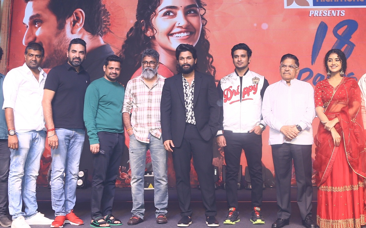 వరుస హిట్ సినిమాలను నిర్మిస్తున్న “జీఏ 2” పిక్చర్స్ మరియు సుకుమార్ రైటింగ్స్ సంయుక్తంగా నిర్మిస్తున్న చిత్రం “18 పేజిస్” నిఖిల్ సిద్దార్థ , అనుపమ పరమేశ్వరన్ నటిస్తున్న ఈ సినిమాను బన్నీ వాసు నిర్మిస్తున్నారు.మెగా నిర్మాత అల్లు అరవింద్ సమర్పిస్తున్నారు. ఈ సినిమాను క్రిస్టమస్ కానుకగా డిసంబర్ 23న రిలీజ్ చేయనున్నారు.ఇందులో భాగంగా ఈ చిత్ర ప్రీ రిలీజ్ ఈవెంట్ ను నిర్వహించారు. ఐకాన్ స్టార్ అల్లు అర్జున్ ముఖ్య అతిధిగా హాజరయ్యారు.