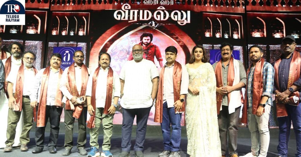 ‘అసుర హననం’ గీతావిష్కరణ కార్యక్రమంలో సంగీత దర్శకుడు ఎం.ఎం. కీరవాణి మాట్లాడుతూ, “హరి హర వీరమల్లు సినిమాతో నా ప్రయాణం ఐదేళ్ల క్రితం రాధాకృష్ణ(క్రిష్)తో మొదలైంది, ఇప్పుడు జ్యోతికృష్ణతో పూర్తవుతుంది. నేను చాలామంది దర్శకులను చూశాను. కానీ, తక్కువమందిలో ఉండే అరుదైన క్వాలిటీ జ్యోతిలో ఉంది. వేగంగా నిర్ణయం తీసుకుంటాడు, ఆ నిర్ణయానికి కట్టుబడి ఉంటాడు. ఎడిటింగ్, గ్రాఫిక్స్, మ్యూజిక్ అన్ని పనులు ఒక్కడే చూసుకుంటూ నిద్రాహారాలు మాని ఈ సినిమా కోసం ఎంతో కష్టపడ్డాడు. ఇండస్ట్రీలో వివాద రహితుడిగా ఎ.ఎం. రత్నం గారికి పేరుంది. లిరిక్ రైటర్ గా ఆయనకు నేను పెద్ద ఫ్యాన్ ని. ఈ సినిమా రూపంలో ఎ.ఎం. రత్నం గారికి మరో భారీ విజయం సొంతం అవుతుందని విశ్వసిస్తున్నాను. అలాగే నిర్మాత దయాకర్ గారంటే నాకెంతో గౌరవం. ఈ సినిమాలో ఆయన పాత్ర ఎంతో ఉంది. రాంబాబు లాంటి మంచి గీత రచయితను నాకు జ్యోతికృష్ణ పరిచయం చేశారు. నిధి అగర్వాల్ తన పాత్రను చక్కగా పోషించింది. పవన్ కళ్యాణ్ గారిని మీరందరూ పవర్ స్టార్ అంటారు. నేను మూర్తీభవించిన ధర్మాగ్రహం అంటాను. ఆగ్రహం మనందరికీ వస్తుంది. కానీ సమాజం కోసం వచ్చేది ధర్మాగ్రహం. ఆయనకు మాత్రమే సరిపోయేలా ‘హరి హర వీరమల్లు’ను తీర్చిదిద్దారు. జయాపజయాలతో సంబంధం లేకుండా దూసుకుపోయే కార్చిచ్చు పవన్ కళ్యాణ్ గారు. కార్చిచ్చు మీద ఎంత వాన పడినా అది ఆగదు. ఆయనతో మొదటిసారి చేస్తున్న సినిమా కాబట్టి ఎంతో శ్రద్ధతో చేశాను. జూన్ 12న విడుదలవుతున్న ఈ సినిమాని మీరు ఆదరిస్తారని ఆశిస్తున్నాను.” అన్నారు.