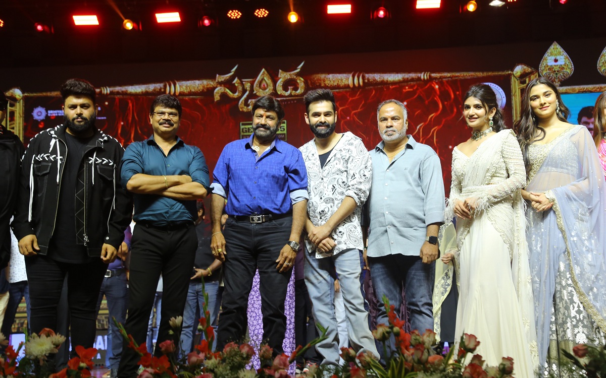 మాస్ మేకర్ బోయపాటి శ్రీను ‘అఖండ’ బ్లాక్బస్టర్ విజయం తర్వాత ఉస్తాద్ రామ్ పోతినేనితో మాస్ యాక్షన్ పాన్ ఇండియా ఎంటర్టైనర్ ‘స్కంద- ది ఎటాకర్’ రూపొందిస్తున్నారు. మోస్ట్ హ్యాపెనింగ్ హీరోయిన్ శ్రీలీల ఈ చిత్రంలో కథానాయికగా నటిస్తున్నారు. శ్రీనివాసా సిల్వర్ స్క్రీన్ బ్యానర్ పై అత్యున్నత సాంకేతిక ప్రమాణాలు, నిర్మాణ విలువలతో భారీ బడ్జెట్ తో శ్రీనివాస చిట్టూరి ప్రతిష్టాత్మకంగా ఈ చిత్రాన్ని నిర్మిస్తున్నారు. ఇప్పటికే సినిమాకు సంబంధించిన ప్రమోషన్ కార్యక్రమాలు జోరుగా జరుగుతున్నాయి. టైటిల్ గ్లింప్స్ కు టెర్రిఫిక్ రెస్పాన్స్ వచ్చింది. థమన్ స్కోర్ చేసిన మొదటి రెండు పాటలు మ్యూజిక్ చార్ట్లలో టాప్ లో వున్నాయి. స్కంద తెలుగు, తమిళం, కన్నడ, మలయాళం, హిందీ భాషల్లో సెప్టెంబర్ 15న ప్రపంచ వ్యాప్తంగా విడుదలౌతున్న నేపథ్యంలో ఈ చిత్రం ప్రీ రిలీజ్ థండర్ ఈవెంట్ నిర్వహించారు. నటసింహ నందమూరి బాలకృష్ణ ముఖ్య అతిథిగా హాజరైన ఈ వేడుక చాలా గ్రాండ్ గా జరిగింది.