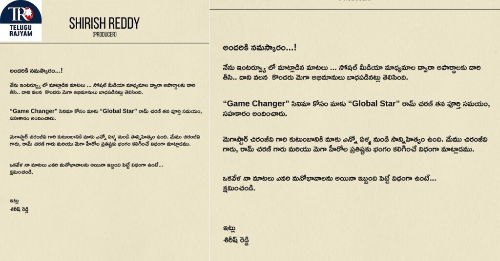 తెలుగు సినీ ప్రేక్షకులకు, మెగా అభిమానులకు నమస్కారం. మా ఎస్వీసీ సంస్థకు, రామ్ చరణ్ గారికి, చిరంజీవి గారికి ఎంతో అవినాభావ సంబంధం ఉంది. చరణ్ గారికి నాకు మంచి అనుబంధం ఉంది. నేను అభిమానించే హీరోల్లో రామ్ చరణ్ గారు ఒకరు. ఆయన్ని అవమానపరచడం గాని, కించపరచడం గాని నా జన్మలో ఎప్పుడూ చేయను.