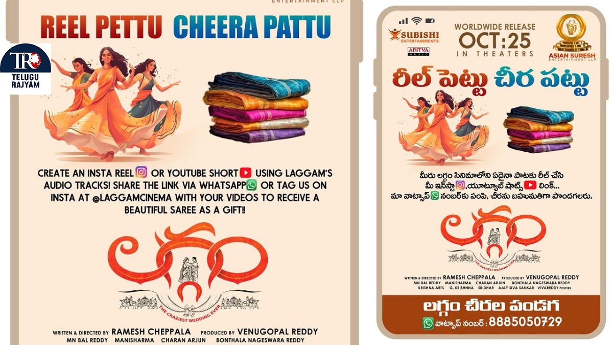 లగ్గం చిత్ర యూనిట్ వినూత్నంగా ప్రమోషన్స్ లో దూసుకెళుతోంది… ఈ క్రమంలో లగ్గం చీరల పండుగ పేరుతో రీల్ పెట్టు – చీర పట్టు అనే కార్యక్రమంకు శ్రీకారం చుట్టారు. ఆసక్తి కలిగిన యువకులు ఇన్స్టాగ్రామ్ లో లగ్గం సినిమాకు సంభందించి పాటలకు గానీ లేదా టీజర్ లో డైలాగ్స్ కు గాని తమ స్టైల్ లో రీల్ లేదా యూట్యూబ్ షాట్ చేసి 8885050729 నెంబర్ కు పంపితే చీర ను గిఫ్ట్ గా పొందవచ్చు… అలాగే రీల్ ను తప్పకుండా వారి అకౌంట్ లో పోస్ట్ చేసి లగ్గం పేజీ కి టాక్ చెయ్యాలి, బహుమతులు అందచేయడానికి లగ్గం యూనిట్ సిద్ధంగా ఉంది.
