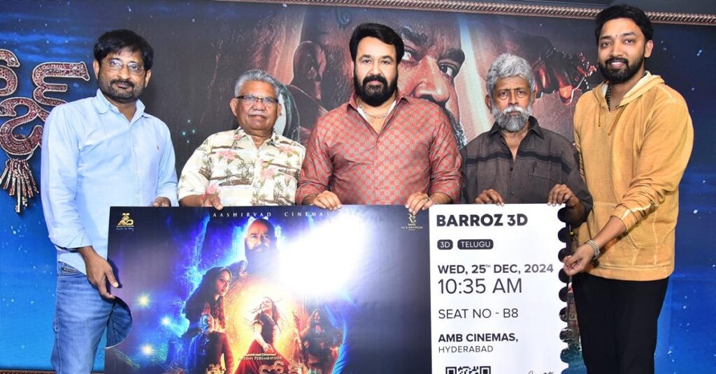 మలయాళ సూపర్ స్టార్ మోహన్ లాల్ టైటిల్ రోల్ నటిస్తూ స్వీయ దర్శకత్వం వహిస్తున్న ఎపిక్ ఫాంటసీ అడ్వంచర్ ‘బరోజ్ 3డీ’. ఈ ఎపిక్ డ్రామా ఫాంటసీ సినిమాని ఆశీర్వాద్ సినిమాస్ పతాకంపై ఆంటోని పెరుంబవూర్ గ్రాండ్ గా నిర్మిస్తున్నారు. ఇప్పటికే విడుదలైన ప్రమోషనల్ కంటెంట్ నేషనల్ వైడ్ గా హ్యుజ్ బజ్ క్రియేట్ చేసి సినిమాపై అంచనాలు పెంచాయి. వరుస విజయాలతో దూసుకుపోతున్న మైత్రీ మూవీ డిస్ట్రిబ్యూటర్స్ ఈ సినిమా తెలుగులో గ్రాండ్ గా రిలీజ్ చేస్తున్నారు. క్రిస్మస్ కానుకగా డిసెంబర్ 25న ఈ సినిమా విడుదల కానుంది. ఈ సందర్భంగా మేకర్స్ ప్రీరిలీజ్ ప్రెస్ మీట్ ని నిర్వహించారు.