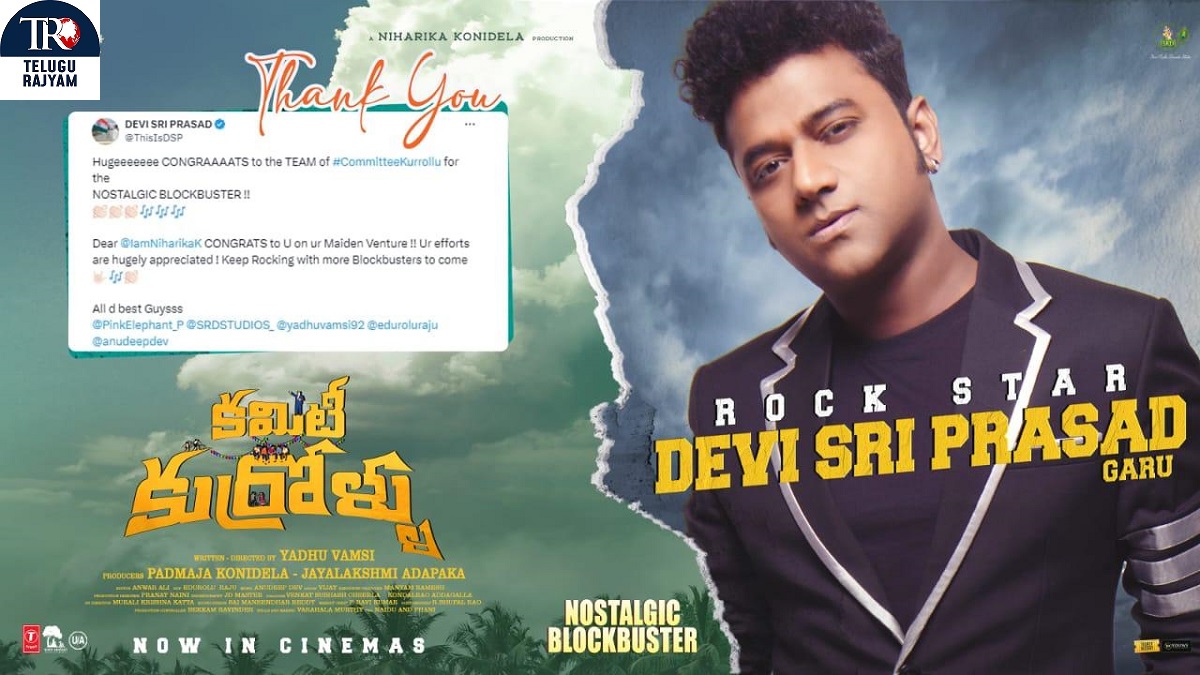 * ‘కమిటీ కుర్రోళ్ళు’ చిత్రానికి చాలా పెద్ద కంగ్రాట్స్. అద్భుతమైన విజయం. తొలి చిత్రంతోనే బ్లాక్ బస్టర్ సాధించిన నిహారికకు అభినందనలు. మీ గొప్ప ప్రయత్నం చేశారు. ఇలాంటి విజయాలను మరెన్నింటినో సాంచాలి – దేవి శ్రీ ప్రసాద్