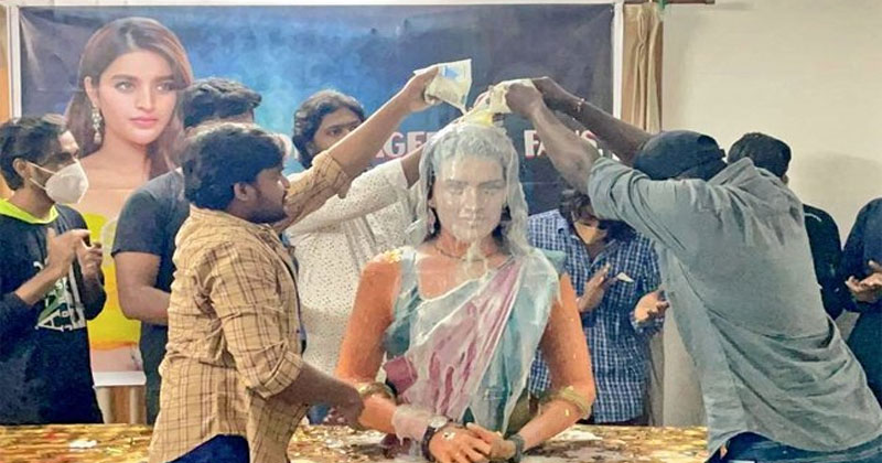 చూడ చక్కని అందం, ఆకట్టుకునే అభినయం నిధి అగర్వాల్ సొంతం. తనలో ఎంతో టాలెంట్ దాగి ఉన్నప్పటికి అది జనాల వరకు రావడానికి చాలా టైం పట్టింది. పూరీ జగన్నాథ్ తెరకెక్కించిన ఇస్మార్ట్ శంకర్ చిత్రంతో నిధి అగర్వాల్ క్రేజ్ విపరీతంగా పెరిగింది. నిధి అగర్వాల్ కు ఇప్పుడు వీరాభిమానులు తయారయ్యారు. ఎంతలా అంటే ఆమెకు గుడులు కట్టి పూజలు చేసే అంతలా. మీరు విన్నది నిజమే.. తమిళనాడులో వాలంటైన్స్ డే సందర్భంగా ఆమె అభిమానులు నిధి అగర్వాల్కు గుడి కట్టి పూజలు చేశారు. పాలాభిషేకాలు చేశారు. ఆ తర్వాత కేక్ కట్ చేసి సంబరాలు చేసుకున్నారు.