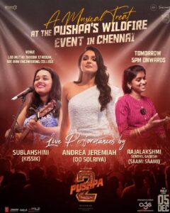 ఇప్పటికే ట్రైలర్ ఈంట్ పాట్నాలో చెయ్యగా ఇప్పుడు చెన్నై లో ఒక మ్యూజికల్ ఈవెంట్ నిర్వహించనున్నారు. చెన్నైలోని లియో ముత్తు ఇండోర్ స్టేడియం, సాయి రామ్ ఇంజినీరింగ్ కాలేజీలో ఈ ఈవెంట్ నవంబర్ 24న సాయంత్రం 5 గంటల నుండి స్టార్ట్ చెయ్యనున్నారు. కాగా ఈ ఈవెంట్ లో ప్రముఖ స్టార్ సింగర్స్ లైవ్ పర్ఫామెన్స్ కూడా ఇవ్వనున్నారట. ఈవెంట్ కోసం స్టార్ సింగర్స్ ని రంగంలోకి దింపారు మూవీ మేకర్స్. రేపు విడుదల కానున్న కిస్సిక్, ఆండ్రియా జెరెమియా ఊ సోల్రియా మావా, రాజలక్ష్మి సామీ సామీ పాటలు పాడనున్నారు. ఇక ఈ పాటలు కూడా అల్లు అర్జున్ పుష్ప సినిమాలోనివే. కాగా ఈ ఈవెంట్ కి మూవీ టీమ్ రానున్నారు.